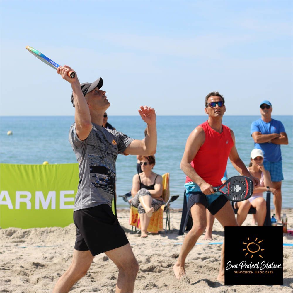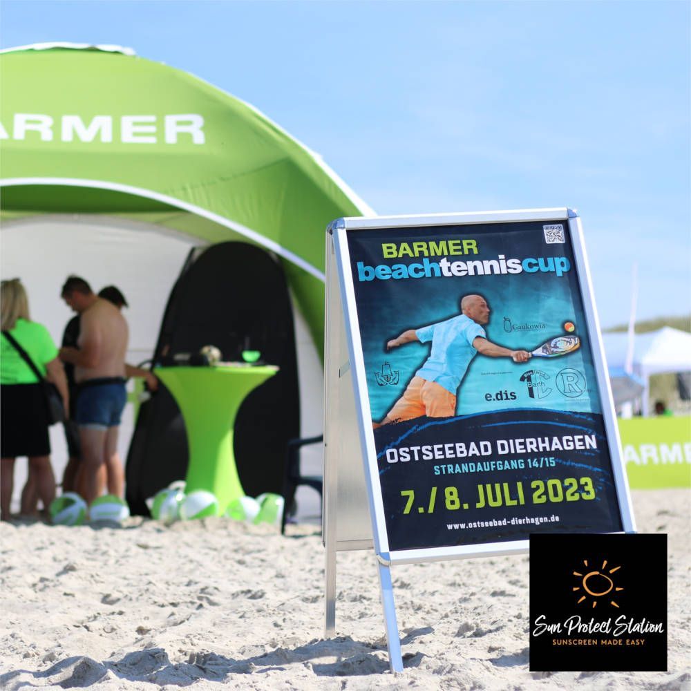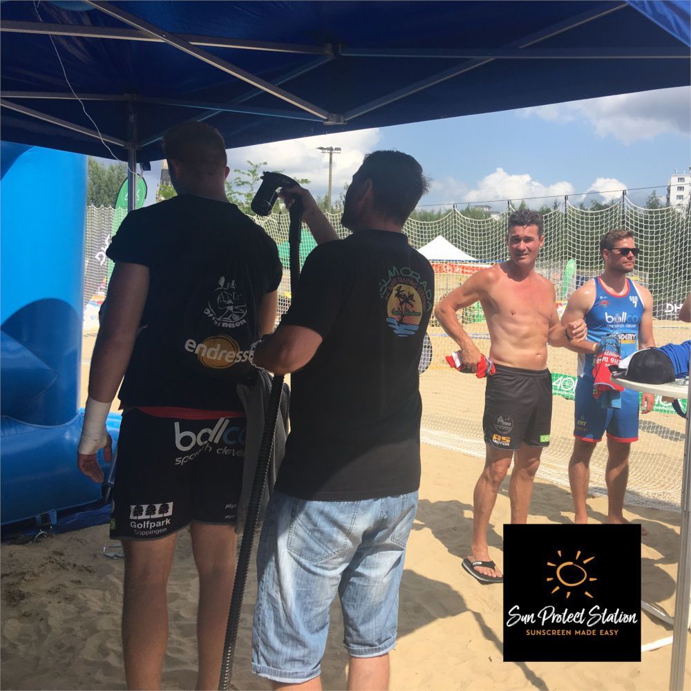 Die Sun Protect Station mit professionellem Sprüh-Personal bietet sekundenschnellen UV-Schutz, egal ob beim Beach-Volleyball-Event, am Sandstrand oder auf einem Festival.