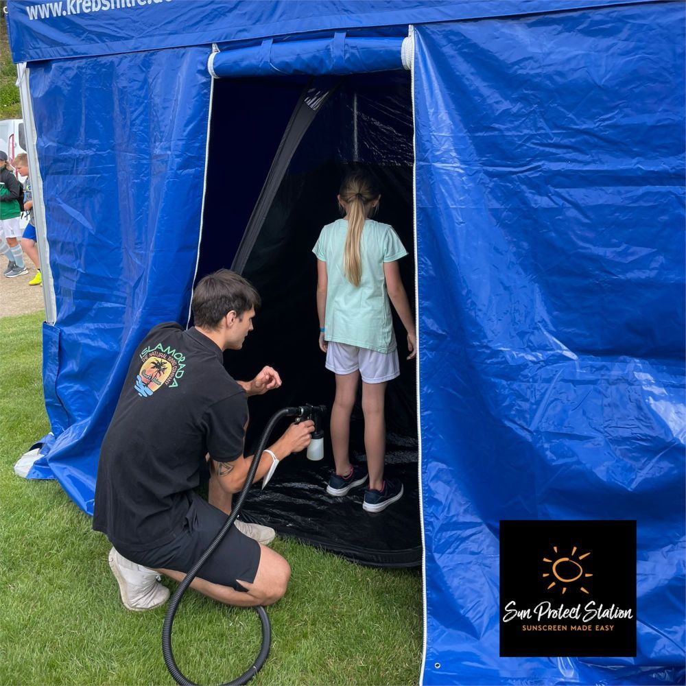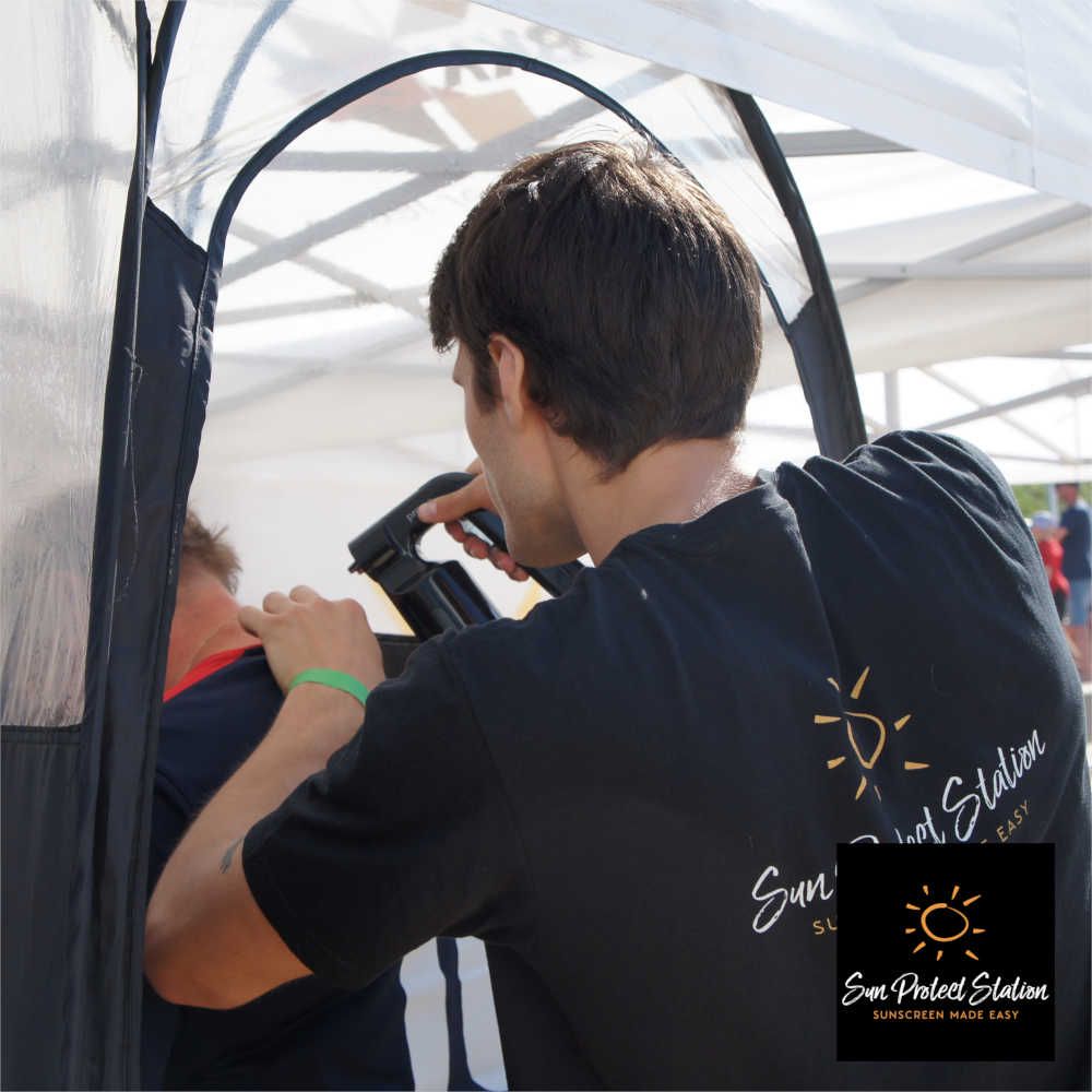 Die Sun Protect Station ist ein einzigartiger Sonnenschutz-Service für Besucher von Outdoor-Events und der Anlaufpunkt für professionellen Sonnenschutz. In wenigen Sekunden wird ein kühlender UV-Schutz, mittels Spray Gun aufgetragen.